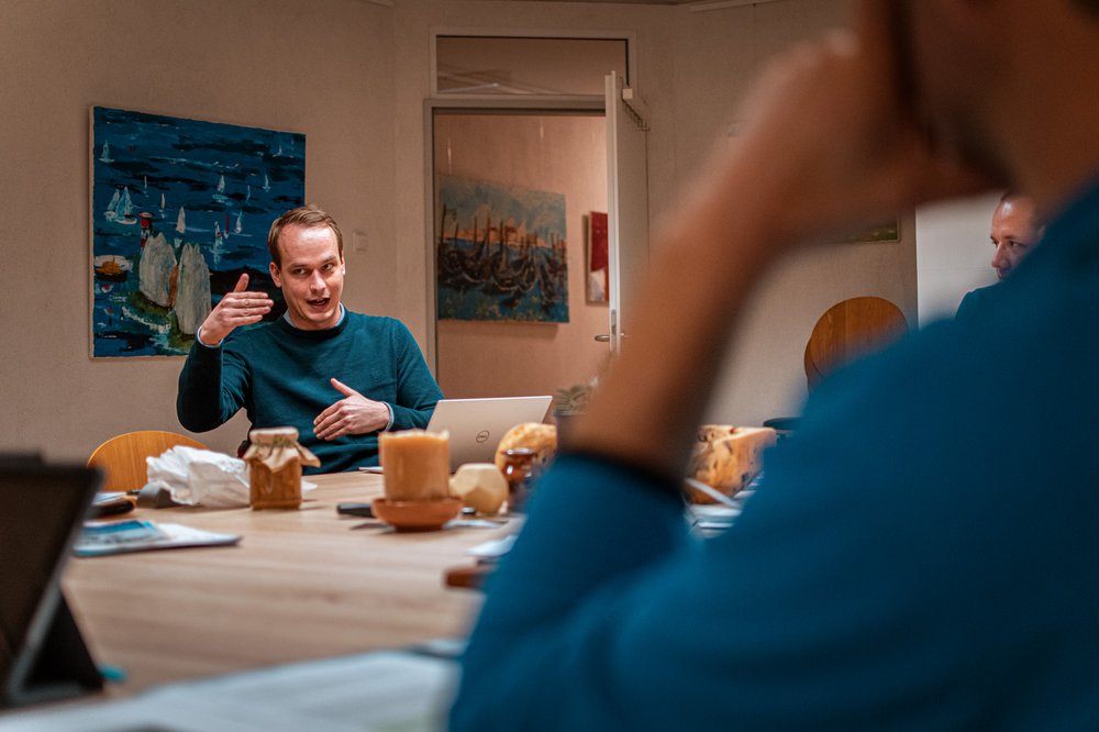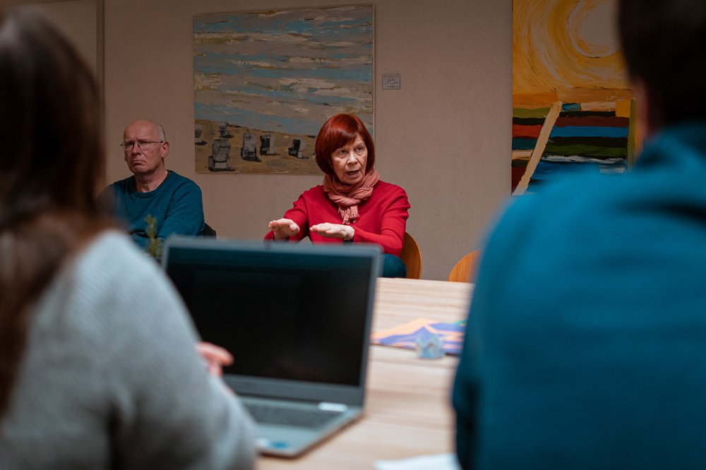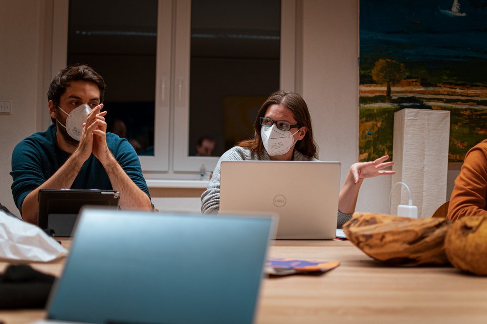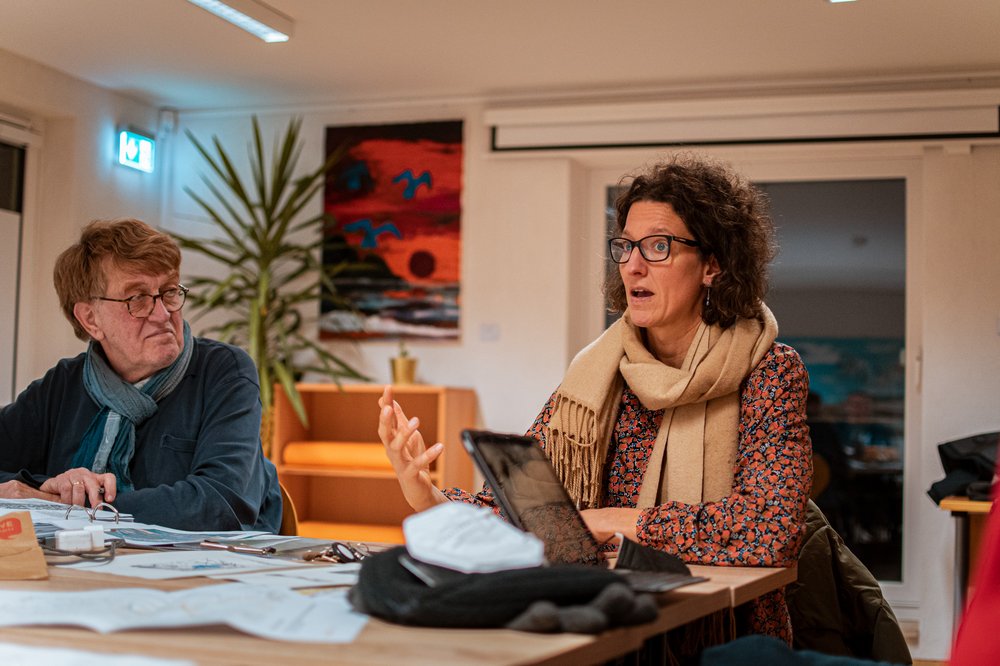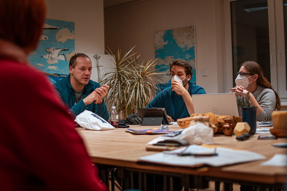 Bilderbeschreibung: Die Bilder zeigen mehrere Personen sitzend an einem Tisch. Einige sind nur mit dem Rücken zu sehen. Andere gestikulieren erklärend.